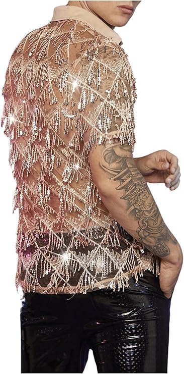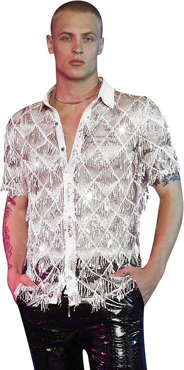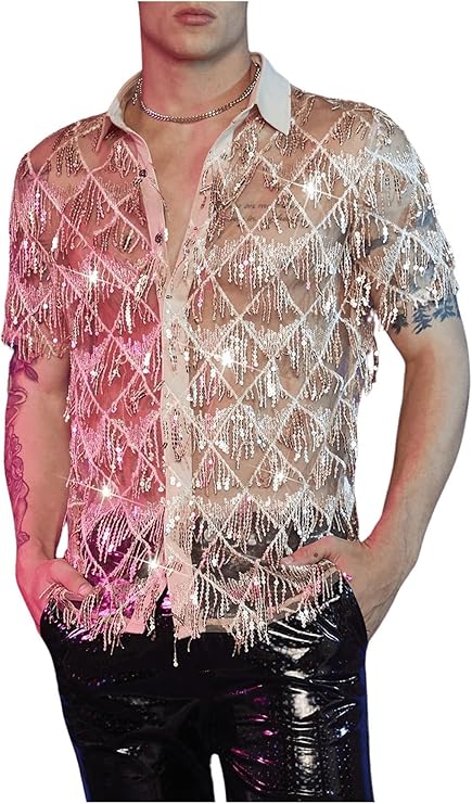 WDIRARA Men's Sequin Decor Fringe Button Front Shirts Short Sleeve Sheer Party T Shirt